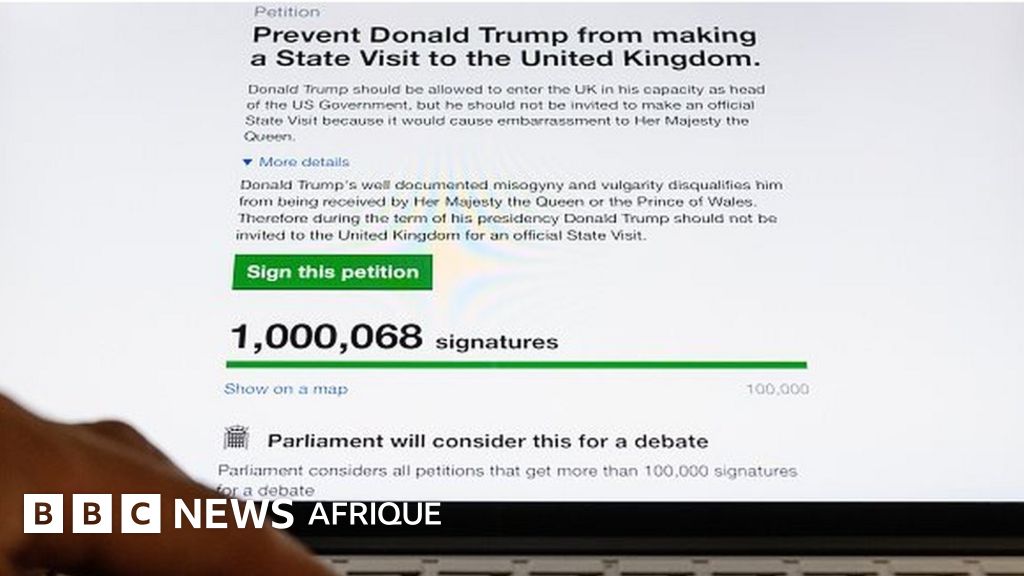 Légende image, Une pétition demandant au Royaume-Uni d'annuler une visite d'Etat de Donald Trump a recueilli plus d'un million de signatures lundi après la polémique suscitée par l'interdiction faite aux ressortissants de sept pays musulmans d'entrer aux Etats-Unis.