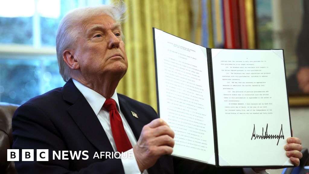 Légende image, Le président Trump montre un ordre signé pour les droits de douane sur les voitures et les pièces détachées le 26 mars.