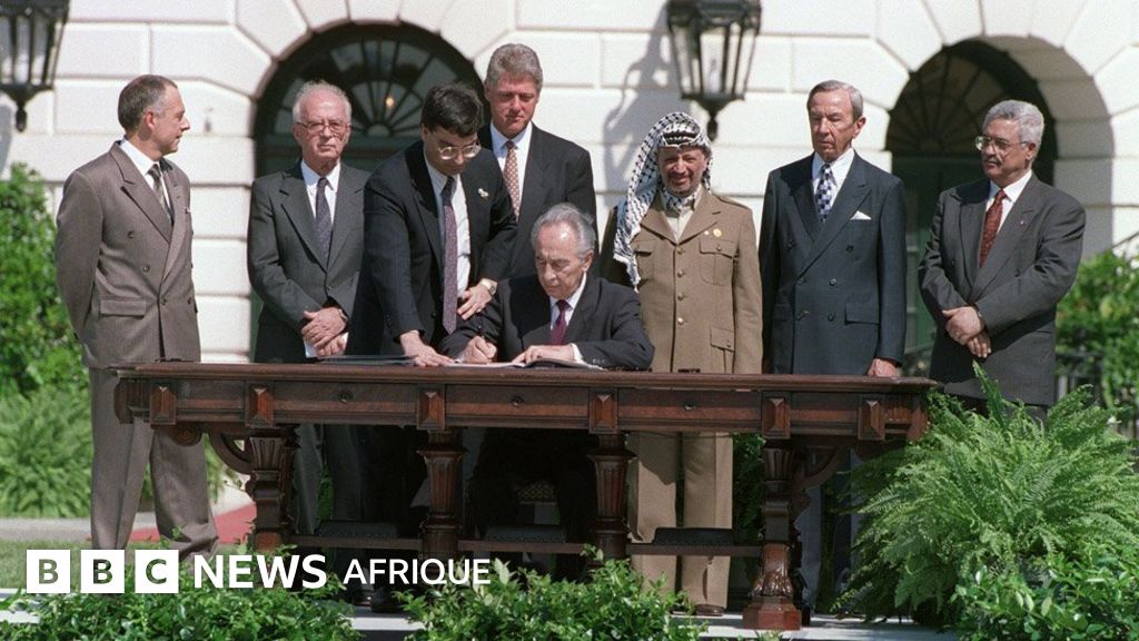Légende image, Shimon Peres (assis) signe les accords d'Oslo en présence du président palestinien Yasser Arafat, de celui des Etats-Unis, Bill Clinton, et de l'ancien président israélien Yitzhak Rabin.