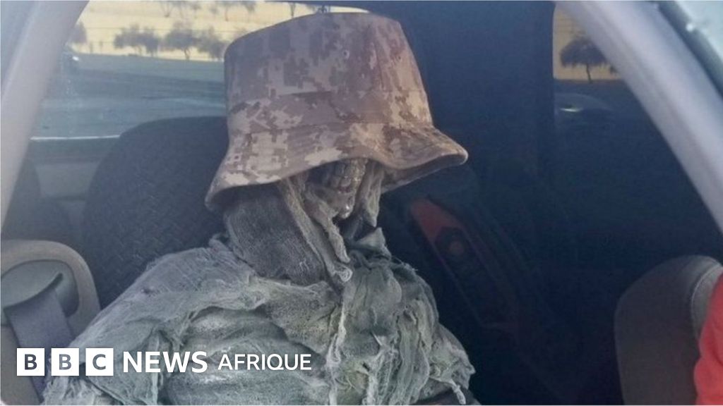 Le message était accompagné d'une photo de la voiture, montrant le faux squelette avec un chapeau de camouflage en forme de seau sur les yeux.