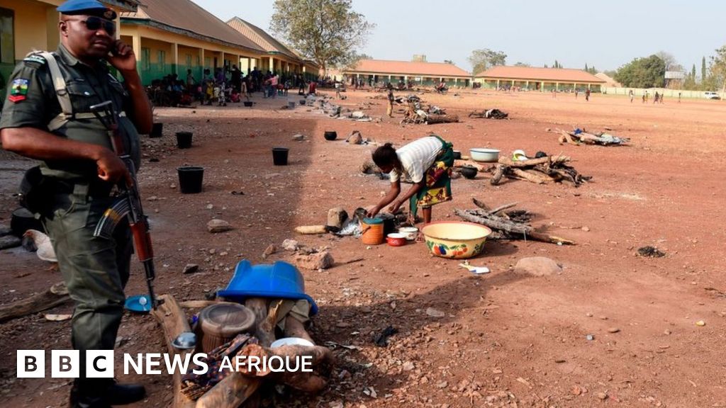 Légende image, Un policier au téléphone, tenant son arme dans un camp de déplacés des violences communautaires.