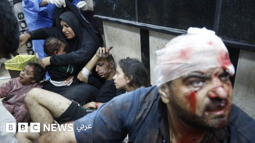 التعليق على الصورة، بعض المصابين الذين وصلوا إلى مستشفى في دير البلح بعد قصف إسرائيلي وسط غزة يوم الاثنين.