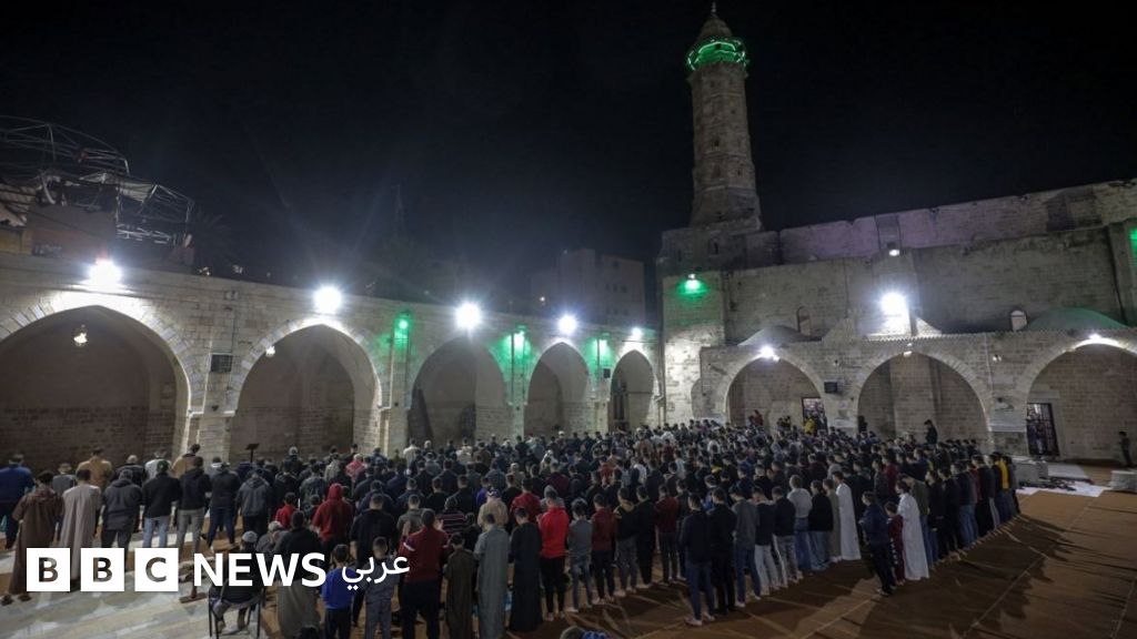 التعليق على الصورة، فلسطينيون يؤدون صلاة التراويح في المسجد العمري في غزة بعد صيام اليوم الخامس من شهر رمضان - 27 مارس/تشرين الأول 2023