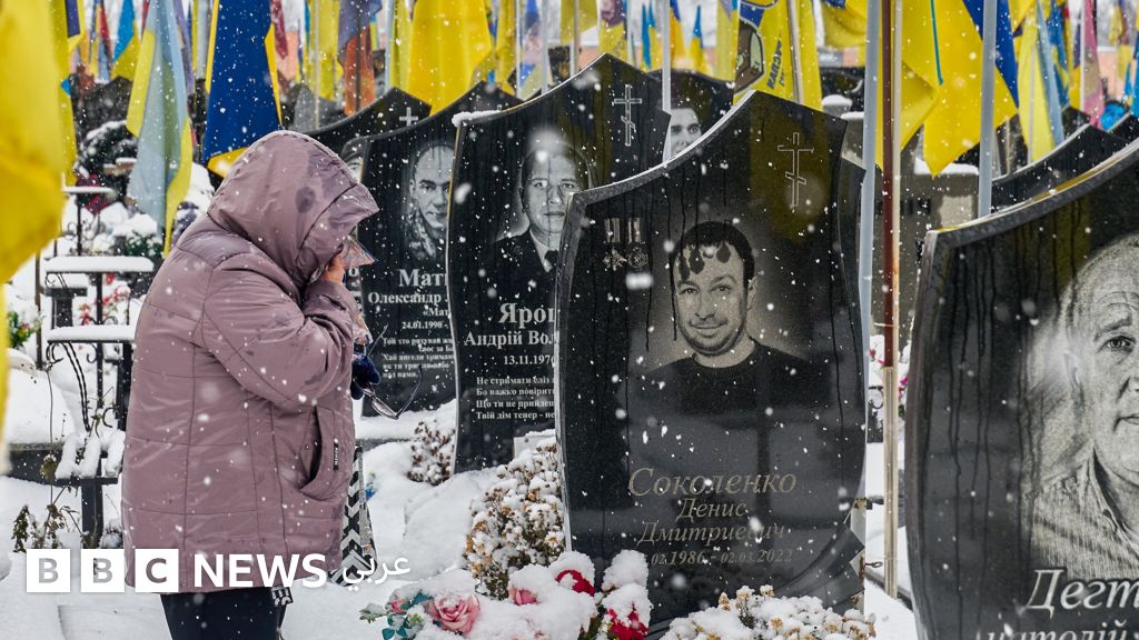 زار مواطن أوكراني قبراً في ممر الأبطال بالمقبرة العسكرية في خاركيف، شمال شرق أوكرانيا، في 28 ديسمبر/كانون الأول 2025، وسط الغزو الروسي المستمر.