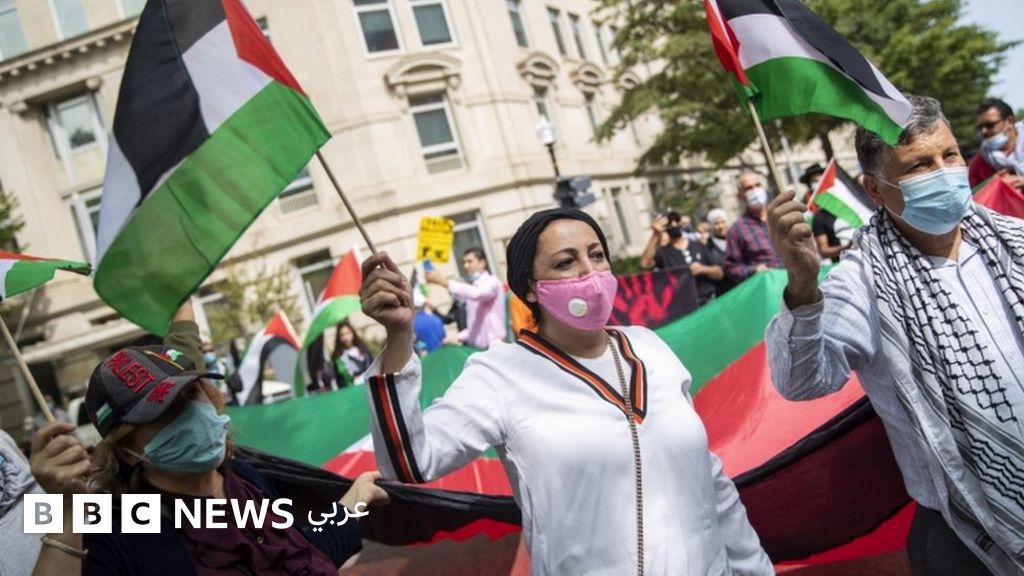 التعليق على الصورة، متظاهرون يرفعون أعلام فلسطين احتجاجا على تطبيع العلاقات مع إسرائيل