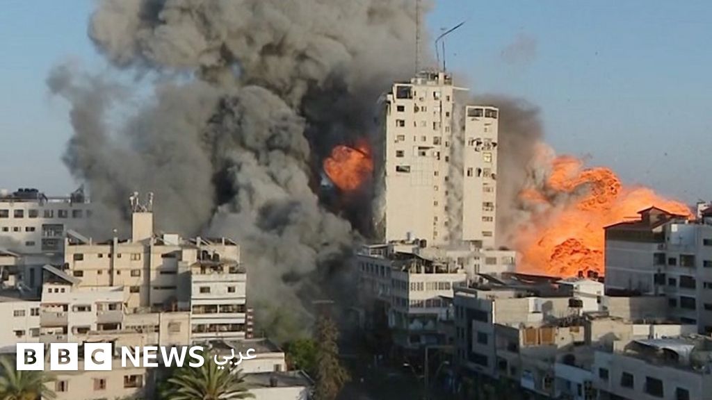 رصدت بي بي سي لحظة تدمير مبنى برج الشروق السكني في غزة في قصف إسرائيلي، خلال لقاء مباشر مع مراسل بي بي سي عربي في القطاع، عدنان البرش.