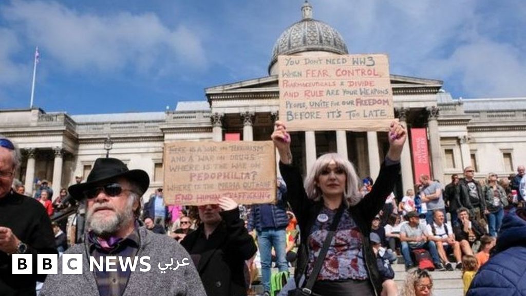 كان الأمر واضحا في شوارع لندن في نهاية الأسبوع الماضي، حيث تناول المتحدثون الموضوعين في خطبهم الموجهة لآلاف المشاركين في مظاهرة مناهضة لاستخدام الكمامات وللإغلاق. وتم عرض ملصقات تروج لكيو أنان ومجموعة من نظريات المؤامرة الأخرى.