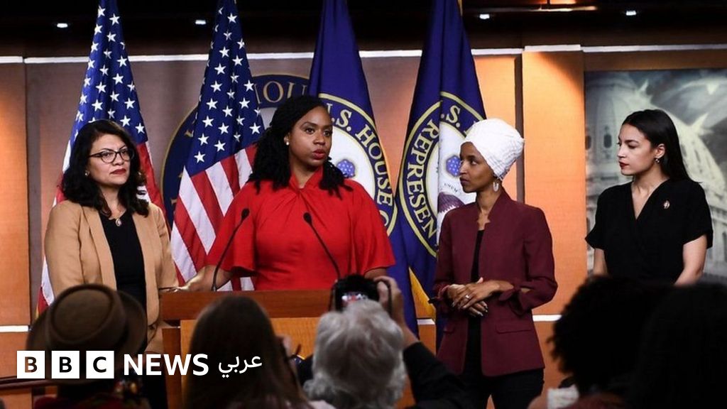التعليق على الصورة، عقدت عضوات الكونغرس اللاتي تعرضن لهجوم من ترامب مؤتمرا صحفيا لرفض ما جاء في تغريداته