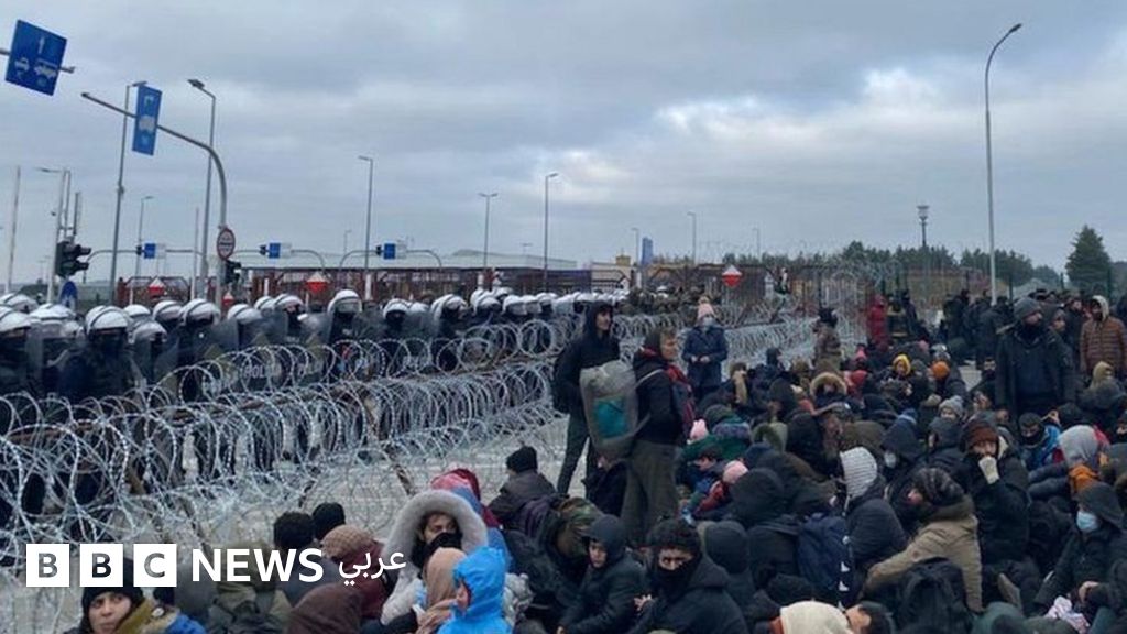 ويظهر فيديو، صورته بي بي سي عند الحدود، مهاجرين يجلسون على أحد الطرق أمام سلك شائك فيما تقف القوات البولندية على الجانب الآخر في مواجهة متوترة.