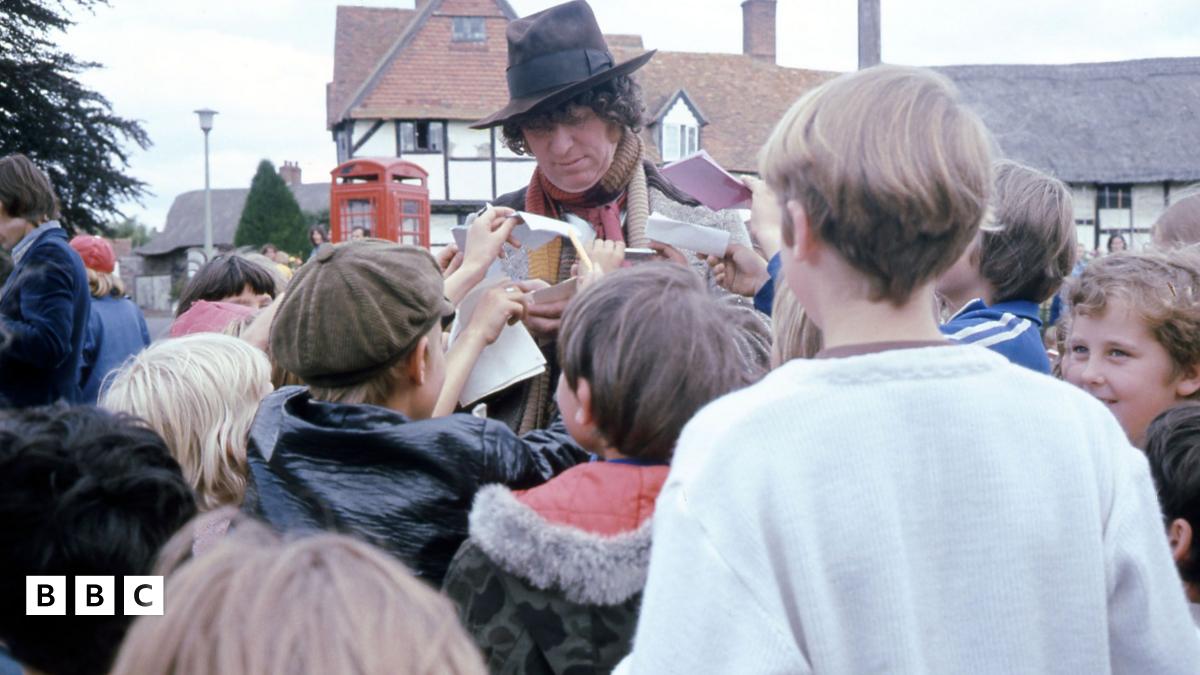 Tom Baker signing autographs for excited fans during filming of The Android Invasion (1975)