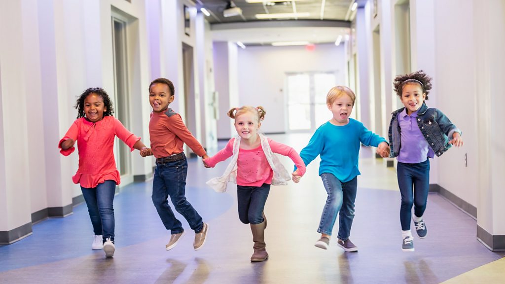 (Image: Children running through a daycare centre in the US. Credit: Getty Images)