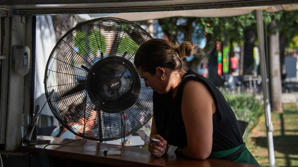 (Picture: A waitress tries to cool down with a fan at a restaurant in Seville on 23 July, 2024, as temperatures rose across southern Europe during a heatwave last summer. July 21, 2024 was the hottest day ever registered globally, according to preliminary data published by the EU's climate monitor. Credit: Getty Images)