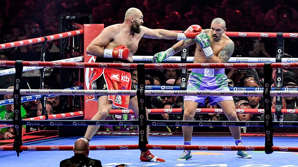 (Image: Britain's Tyson Fury (red) and Ukraine's Oleksandr Usyk (blue) compete during their heavyweight world championship rematch at the Kingdom Arena in Riyadh on December 22, 2024. Credit: AFP via Getty Images)