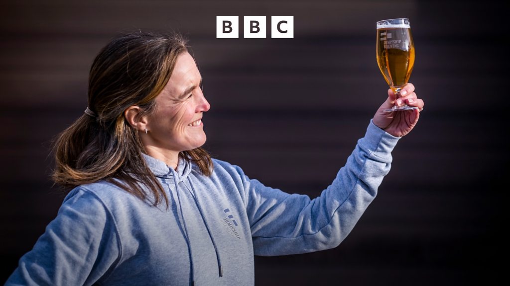 (Picture: Sonja Mitchell, founder of Jump Ship Brewing, based in Scotland, UK, holding a glass of non-alcoholic beer up in the air. Credit: Jump Ship Brewing)