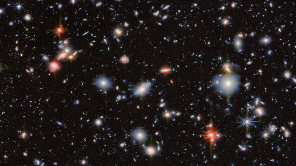 (Photo: An area of deep space with thousands of galaxies in various shapes and sizes on a black background. Most are circles or ovals, with a few spirals. Credit:G. Östlin, P. G. Perez-Gonzalez, J. Melinder, the Jades collaboration, M. Zamani/ESA/Webb, Nasa and CSA)