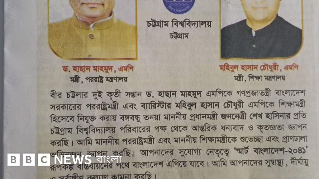 বিজ্ঞাপনটিতে ‘বীর চট্টলার দুই কৃতী সন্তানকে মন্ত্রী হিসেবে নিযুক্ত করায় বঙ্গবন্ধু তনয়া প্রধানমন্ত্রী শেখ হাসিনার প্রতি চট্টগ্রাম বিশ্ববিদ্যালয় পরিবারের পক্ষ থেকে কৃতজ্ঞতা’ জানানো হয়।