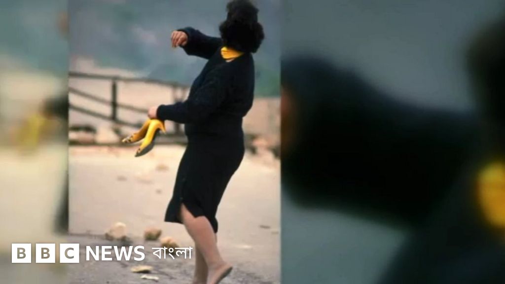 হলুদ স্যান্ডেল হাতে নিয়ে কালো পোশাকের একজন ফিলিস্তিনি নারী ইসরায়েলি পুলিশের দিকে পাথর ছুড়ে মারছে, সারা বিশ্বে ছড়িয়ে পড়া এই ছবিটি ৩০ বছরের পুরনো।