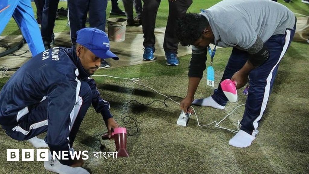 ক্রিকেট: চুল শুকানোর যন্ত্র দিয়ে মাঠ শুকানোর চেষ্টা