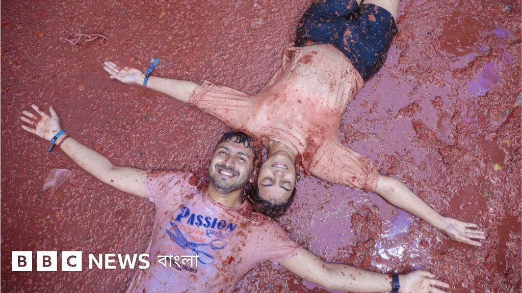 ভিডিও ফুটেজে দেখা যাচ্ছে যে উৎসবের সময় হাজার হাজার মানুষ একে অপরের দিকে টমেটো ছুঁড়ে মারছে।