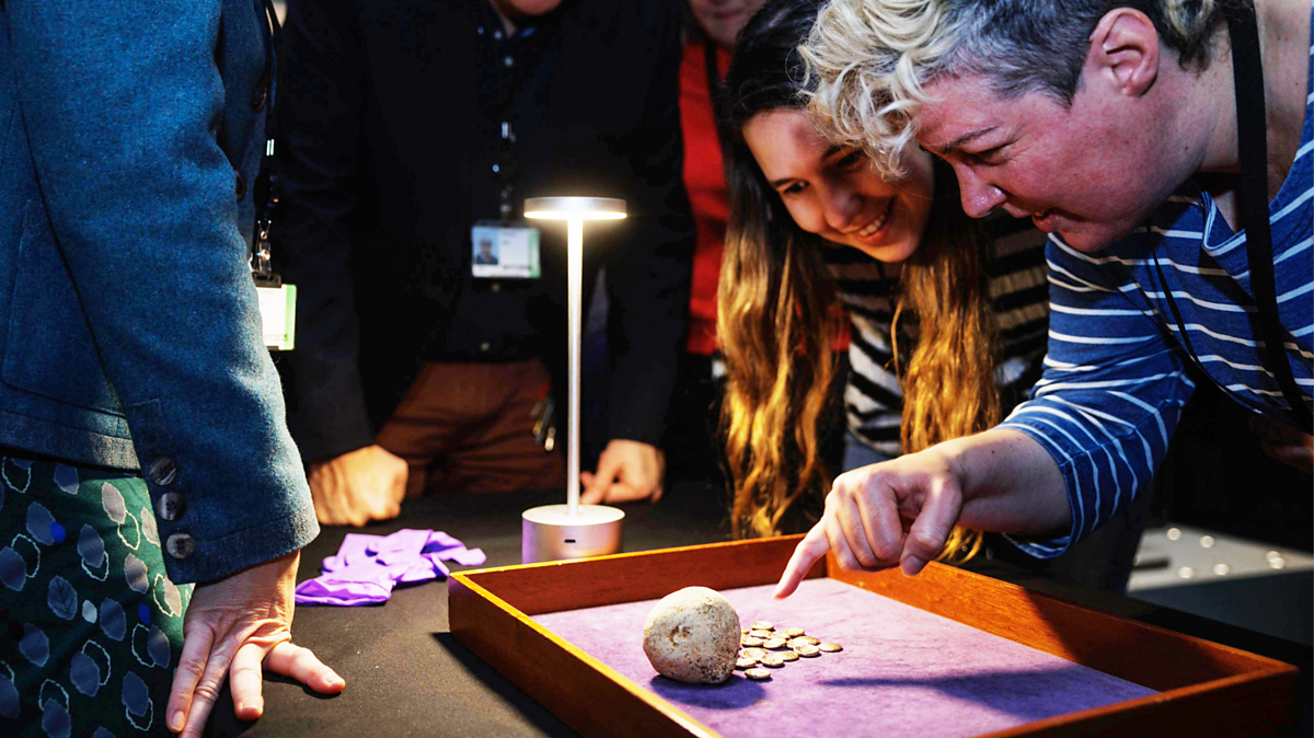 On display at Harborough Museum in Leicestershire, in the year 2000, it was metal detectorist Ken Wallace and other volunteers from the Hallaton Fieldwork Group who first discovered Iron Age coins and Roman pottery in a field. An excavation saw a further discovery of over 5,000 coins and a unique 1st century Roman cavalry helmet.
