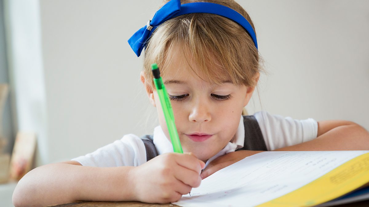 A primary school girl concentrates on writing in a book for her KS2 English SATs
