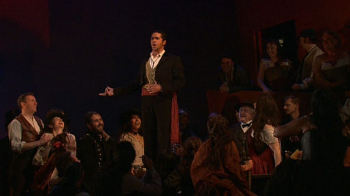 The character Escamillo sings the toreador song from Bizet’s opera ‘Carmen’. The performance is from a grand production on stage in an opera house accompanied by a full orchestra, cast and chorus. The French libretto is translated into English appearing as captions at the bottom of the screen as the character sings the gory story of the bullfight and is joined by the chorus in what is perhaps the most famous of all operatic arias.