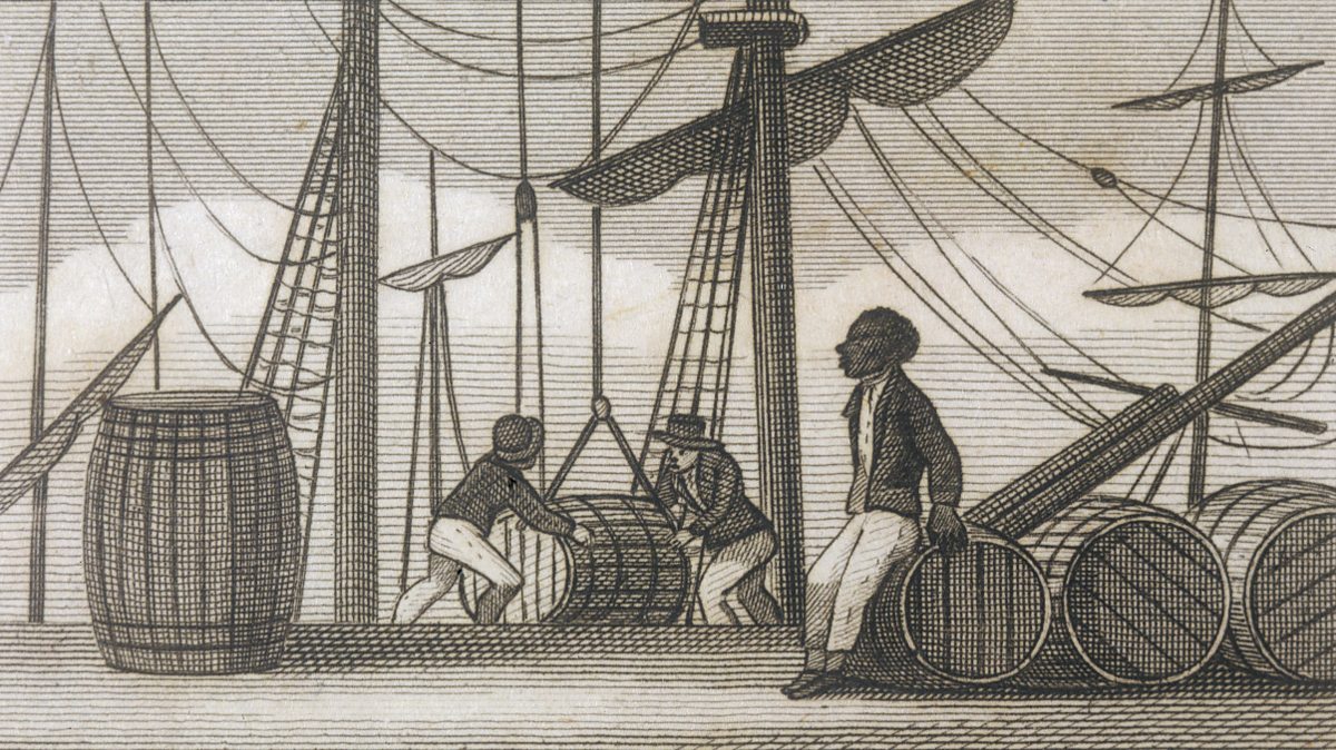 Dealbh de charago ga chur air tìr ann am Bristol. Bha am port na phrìomh ionad airson siùcar air a thoirt a-steach bho phlanntachasan anns na h-Innseachan an Iar.