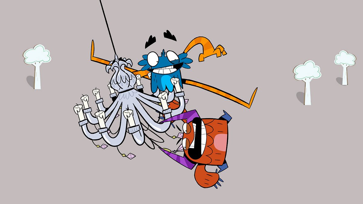 Having another adventure, are we?A suffix is a letter, or a group of letters, that go on the end of a word.The suffix 'ous' changes a noun into an adjective. It means 'full of'.These guys are full of adventure. They're adventurous.And when we add 'ous' to a word ending in e, we drop the e.Argh! Now I'm full of fury.When adding 'ous' to a word ending in y, we replace it with an i.I'm furious.I have got a sense of humour, though.And when adding 'ous', 'our' becomes 'or'.And this is humorous.Hang on. I'll get some sticky tape.