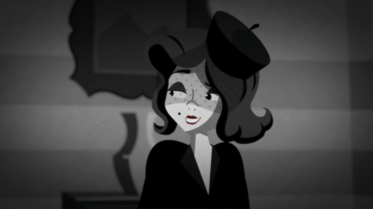An animated film trailer, in the style of a film noir, about a mysterious femme fatale who uses her mystery and charms to bewitch a hotel receptionist and book a hotel room free of charge.