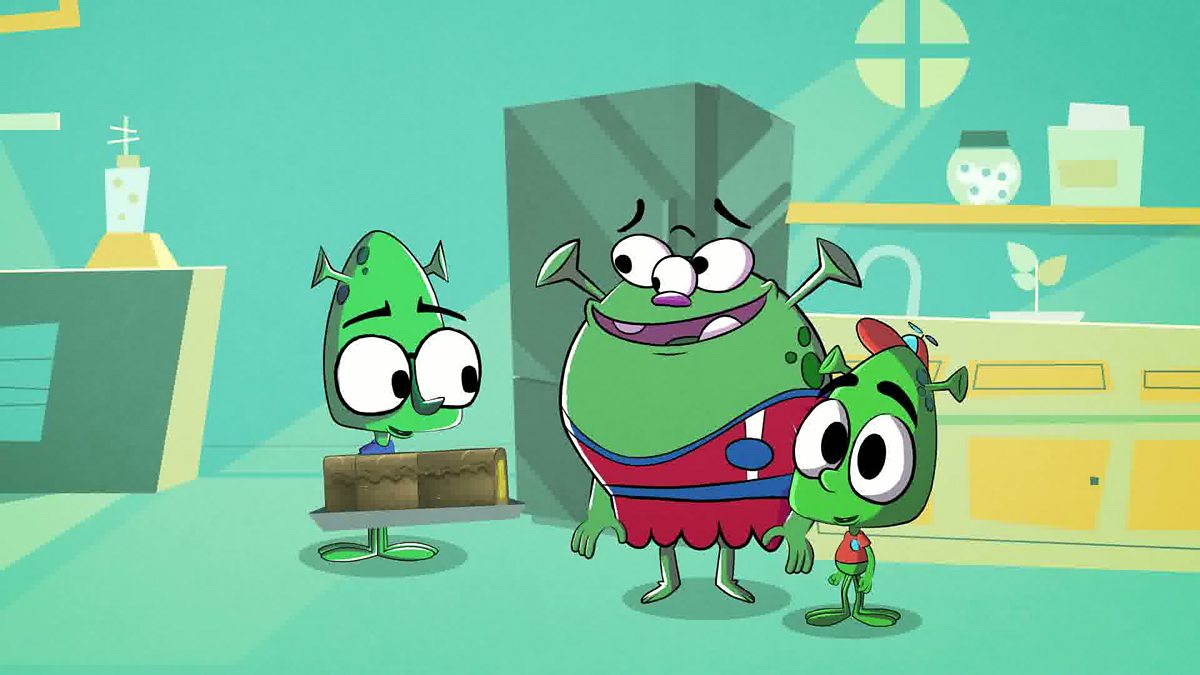 Snoot prepares lunch for Fin and Plimble, comparing fractions of squashsplod pie.