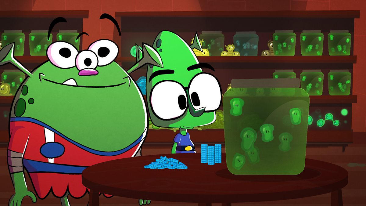 Anns a' bhidio tha Snoot agus Fin a' cur-ris nam bonn a th' aca airson balgain bhlasta a cheannach.