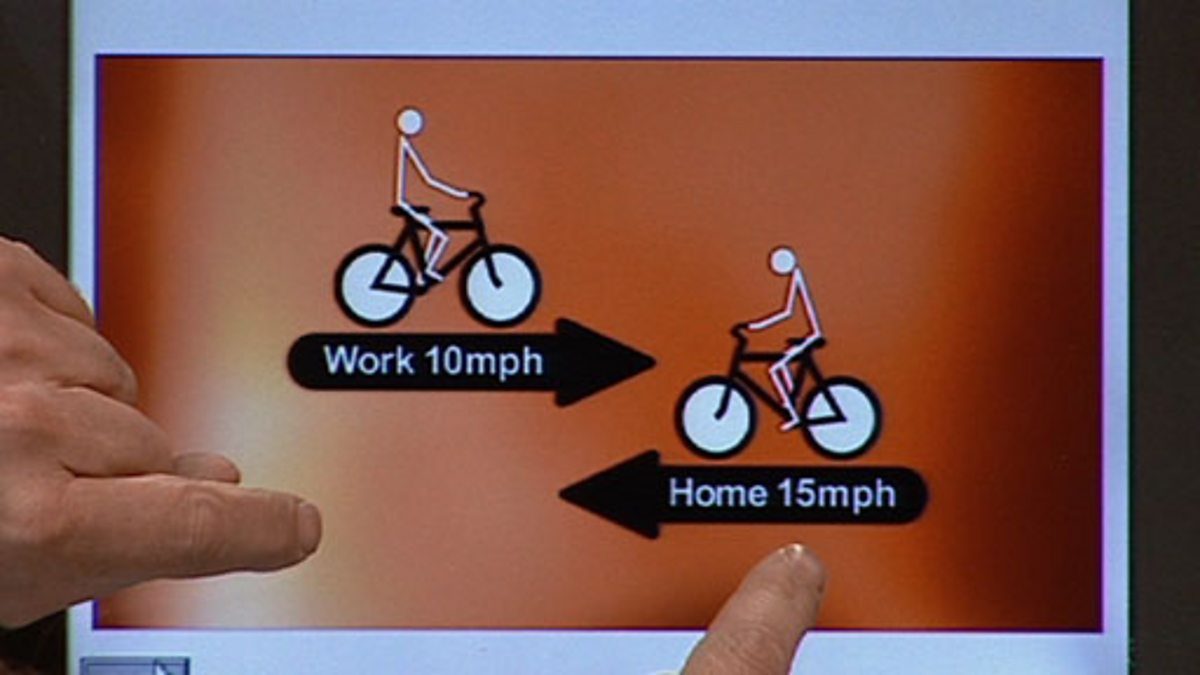 Marcus du Sautoy presents a problem about his imagined commute to work. He can travel 10mph on the way there, and 15mph on the way back. The distance is fixed, so the question is, what is his average speed over the whole journey? Panellists on his puzzle game work towards the solution - which is not simply the mean of the two numbers. Du Sautoy presents the solution, using speed = distance / time.