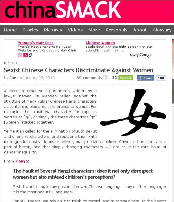Subjects range from celebrity indiscretions to the privileged lives of China's study abroad students to harrowing photos from China's history. Here, a poster on a forum (tianya.cn), writes about the Chinese characters for "woman" and is complaining about what they perceive as the sexist nature of some of them: