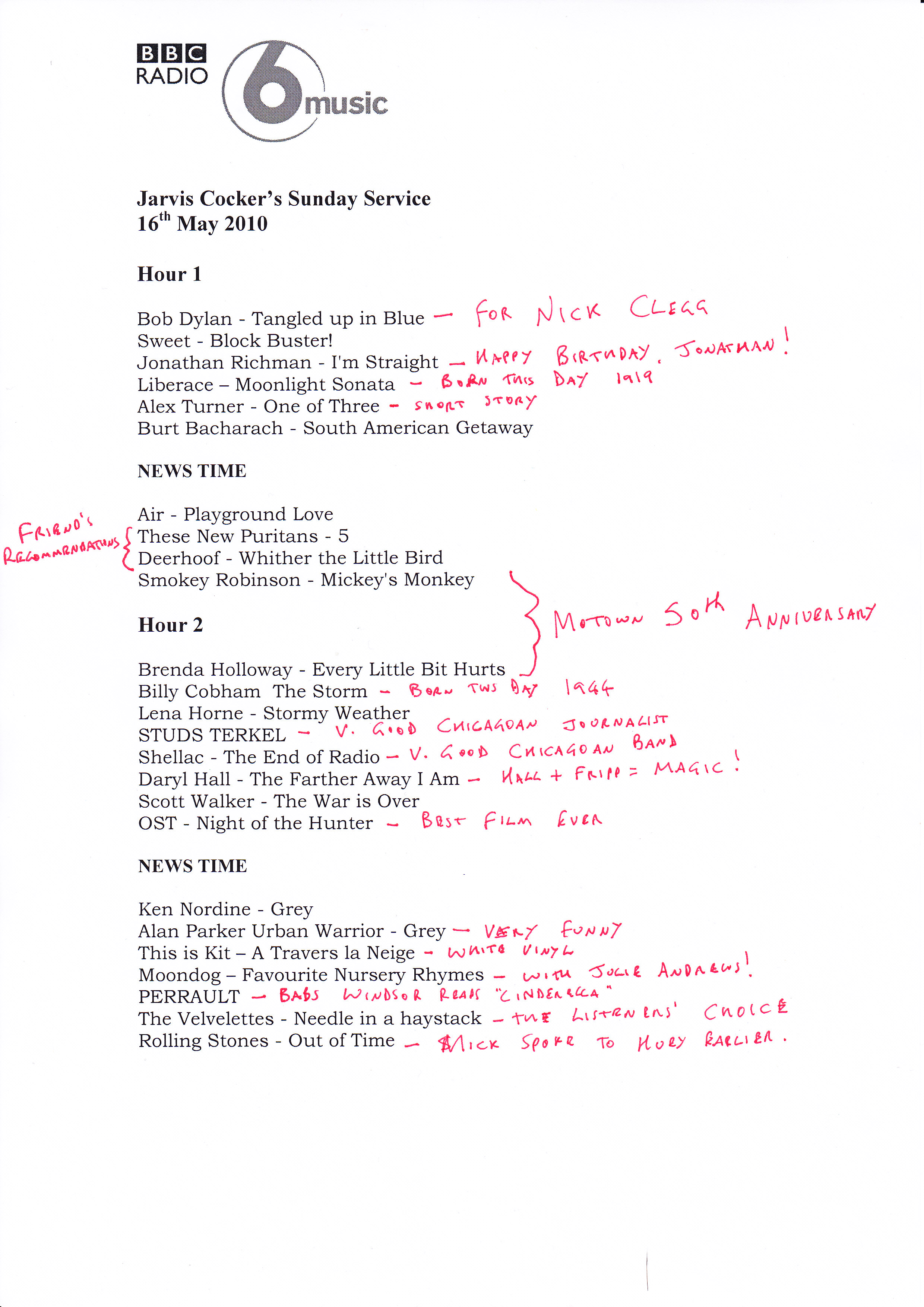 Here once again is the set list from the week's Sunday Service. The show according to Jarvis was a post-election wind-down, which was about as far removed from politics as you could imagine with Arthur Lowe reading a Mr Men story and an extract from Alan Bennett.