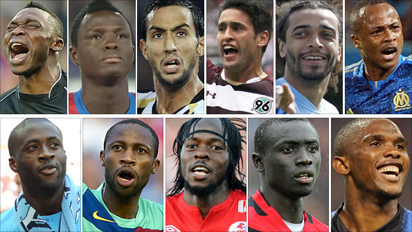 Clockwise from top left: Carlos Kameni, Sammy Inkoom, Mehdi Benatia, Karim Haggui, Benoit Assou-Ekotto, 'Dede' Ayew, Yaya Toure, Seydou Keita, Gervinho, Papiss Demba Cisse and Samuel Eto'o.