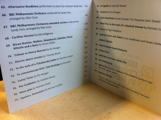 It contains virtually every piece of the Upshares Downshares music sent in by our listeners and broadcast between May 2009 and January 2010. It also contains some bonus tracks, including an interview with the music's composer Sandy Faris and a number of previously unheard renditions. And each CD has a full track listing for all 89 tracks - a total of an hour and twenty minutes.