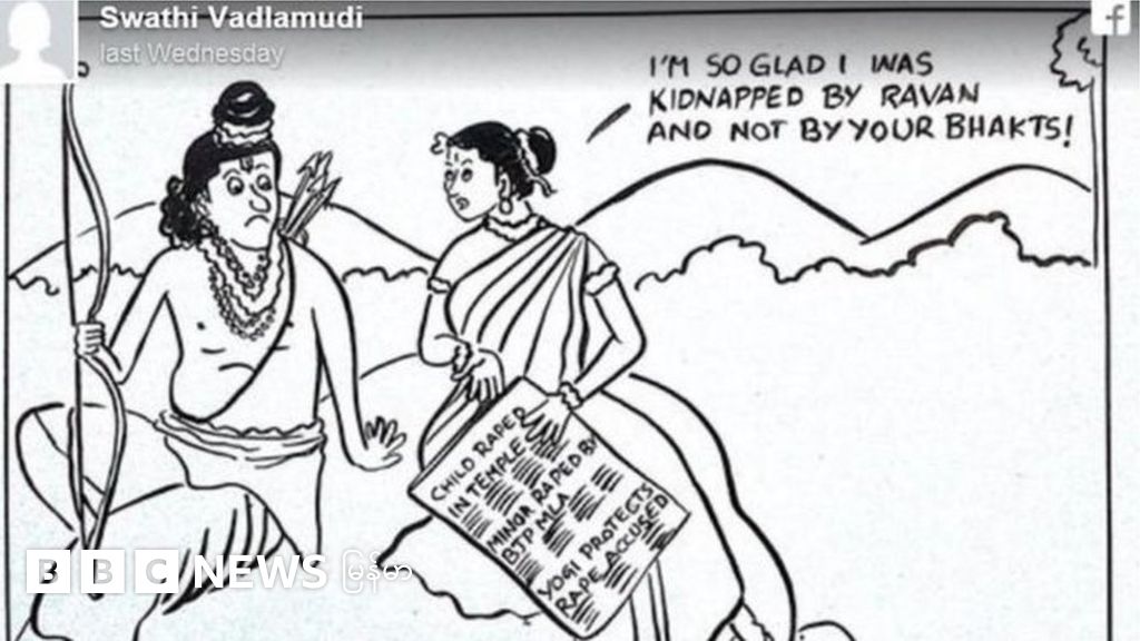 ကာတွန်း ဆရာမ Swathi Vadlamudiဟာ ဟိန္ဒူတွေရဲ့ ဘုရား ရာမနဲ့ ဇနီး သီတာတို့ စကားပြောနေတာကို ကာတွန်းနဲ့ သရုပ်ဖော်ပြီး အာဏာရ ဟိန္ဒူ အမျိုးသား ပါတီ BJPကို သရော်ထားတာ ဖြစ်ပါတယ်။