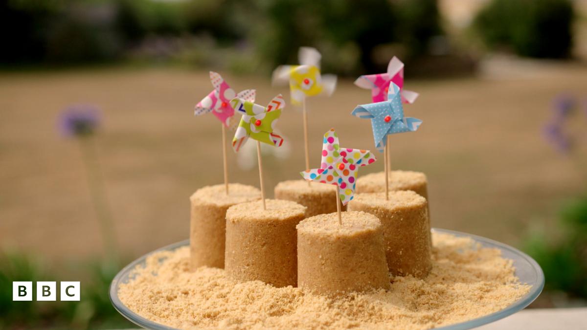 Blitz the biscuits for the sandy beach base and sprinkle over a large platter or cake stand.