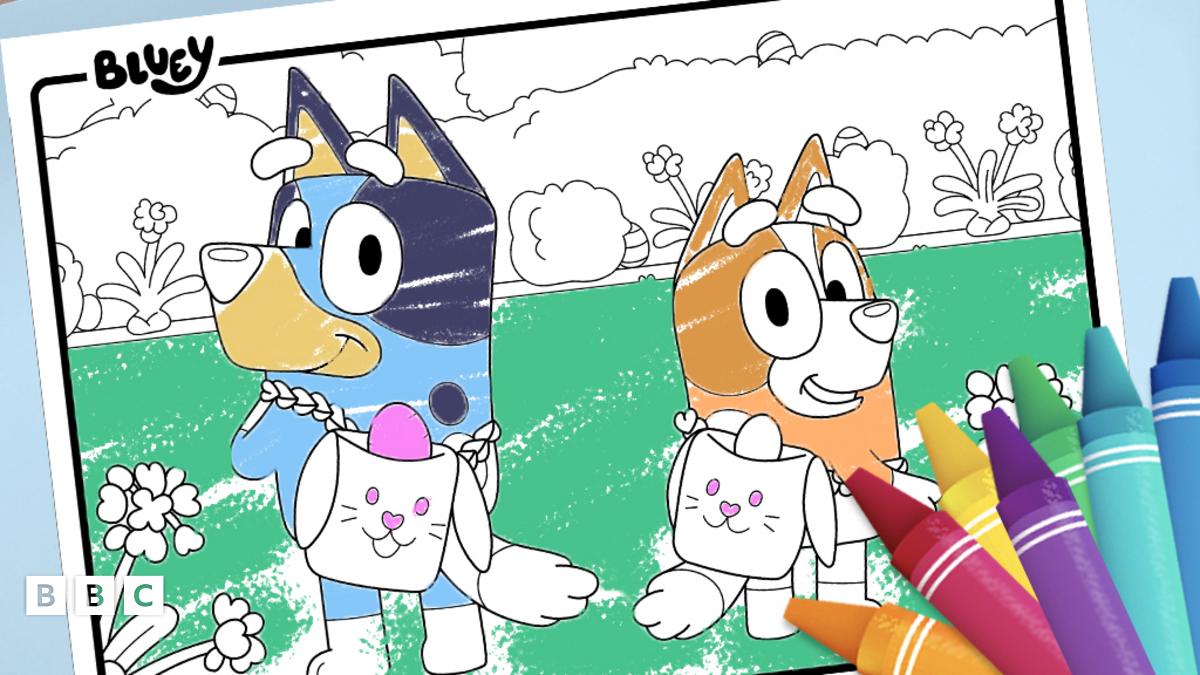 Bluey and Bingo are ready for their egg hunt! Get ready for Easter with these free colouring sheets.