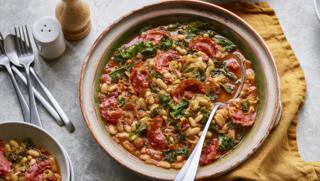 This smoky chorizo, bean and tomato stew creates generous portions and finishing with kale adds colour, texture and an iron boost.