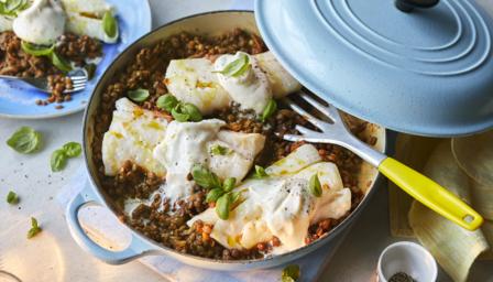 Baked haddock with lentils and mascarpone