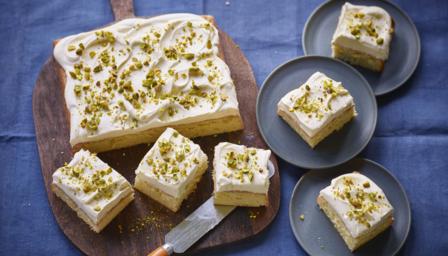 It's perfect as it is, but if you'd like to make your traybake extra special you can sprinkle with almonds, desiccated coconut, rose petals blended with freeze dried raspberries, granulated sugar or chopped pistachios.