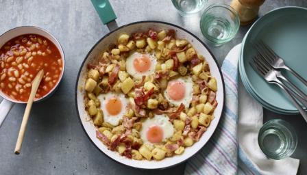While the eggs are cooking, heat the beans in a microwave or in a pan on the hob, according to the instructions on the tin. Serve the potatoes and bacon with the beans alongside.