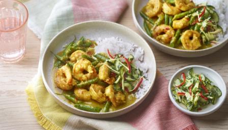 Stir gently, then bring to a simmer. Add the green beans, cook for 4 minutes, then add the prawns. Cook for another 3–5 minutes, until the prawns are just cooked through. Serve with jasmine rice.