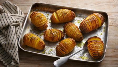 Is it a roastie? Is it a jacket spud? Is it a big round chip? No – it’s a hasselback potato, crisp on the outside, soft in the centre, looks posh but is easy to make and perfect with steak, chicken or fish.