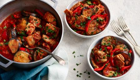 Return the aubergines and red peppers to the pan, folding them through the stew a little. Bake for 20 minutes then serve.