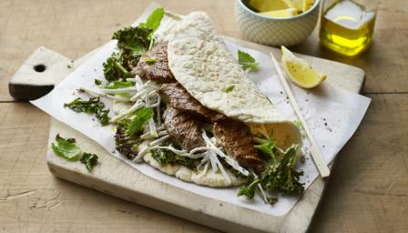 A delicious Greek-style lamb kebab, served with British winter veg – celeriac slaw and crispy chilli kale – all inside a homemade flatbread.
