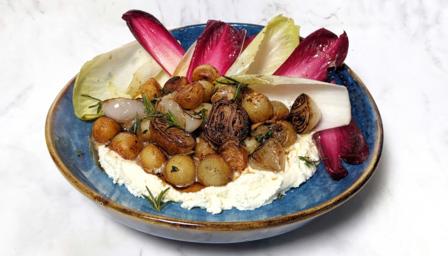 Pommes noisettes, whipped goats' cheese and chicory salad