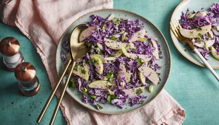 Perfectly balancing the richness of soured cream with fresh apple, this crunchy and colourful coleslaw is quick and easy to make.