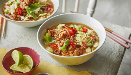 To serve, cook the noodles according to the packet instructions. Split the broth between two bowls, add the noodles and garnish with the crispy tofu, reserved spring onions and coriander leaves. Sprinkle over the chilli, if using. Serve immediately with the lime halves for squeezing, if using.